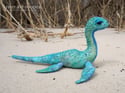 Aqua Nessilet is about 20cm (8") long, with a 14cm (5.5") front flipper span. It is sewn from cotton quilting weight fabrics, with hand embroidered texture and acrylic plushie eyes. It is stuffed with polyfil and contains no wire.