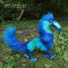 Blue Toucangriff is a poseable art doll with resin cast head and feet. The resin areas are painted with acrylics (including some lovely iridescent blue and green) and sealed with polyurethane varnish. The rest of his body is built of quilt batting over a flexible wire armature, and covered with synthetic fur - all hand sewn over the body before being given a careful haircut and additional color. The bracelets are reclaimed leather, painted, and tied with waxed string.